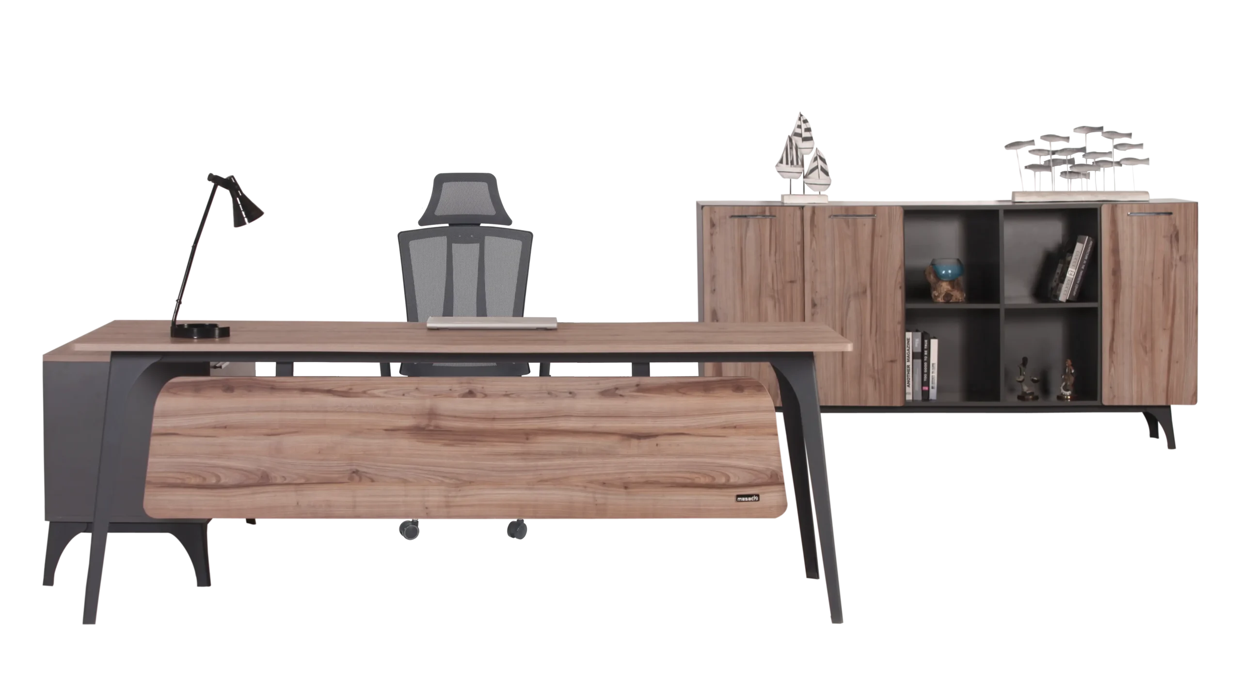 Repeat materials (wood, matte black, glass)