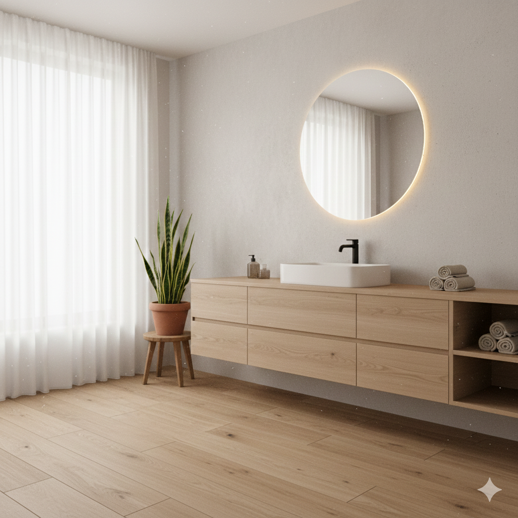 • Functional Light: Task lighting at the mirror (integrated LED strips or side sconces) with a neutral color temperature ($4000text{ K}$) to ensure faithful color reproduction (makeup or shaving).
