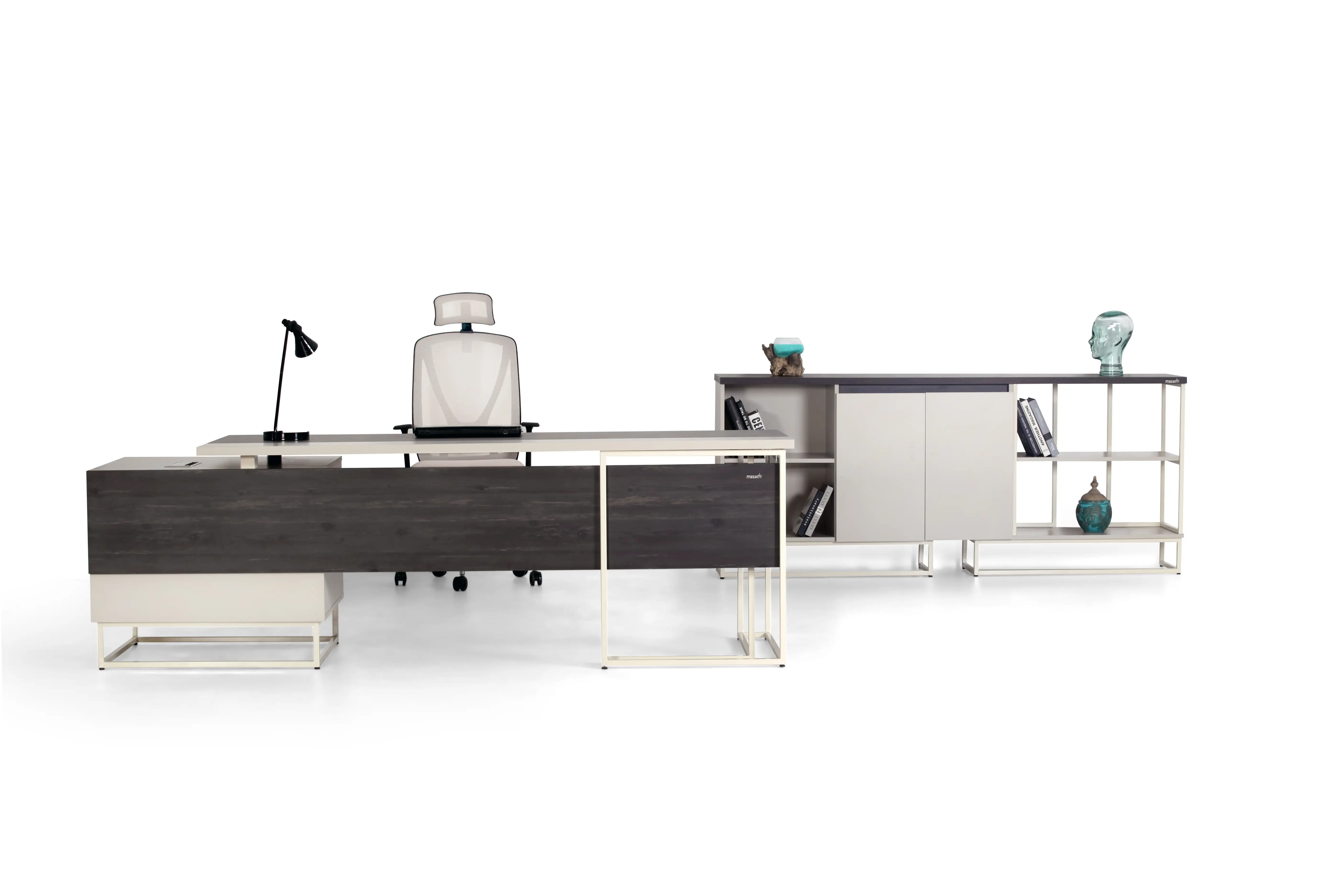 An ideal desk facilitates order and minimizes visual clutter, which is essential for concentration and a clean office design.